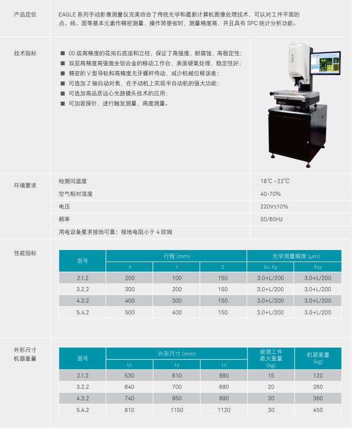 型號(hào):2.1.2/3.2.2/4.3.2/5.4.2 EAGLE 系列手動(dòng)影像測(cè)量?jī)x完美結(jié)合了傳統(tǒng)光學(xué)和最新計(jì)算機(jī)圖像處理 技術(shù).