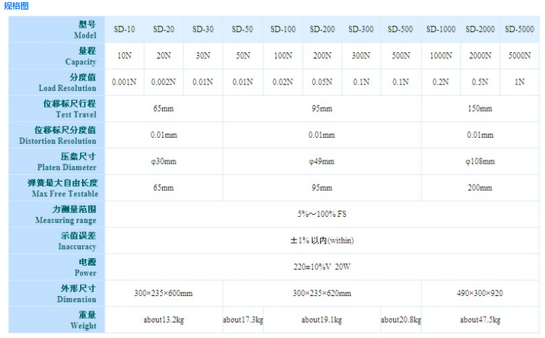 SD系列電子數(shù)顯彈簧拉壓試驗(yàn)機(jī)是測(cè)試?yán)?、壓縮彈簧的變形量和負(fù)荷關(guān)系特性的專用儀器。適用于拉伸、壓縮彈簧在一定工作長(zhǎng)度下的工作負(fù)荷的測(cè)試,也可用于橡膠、簧片等彈性器件的彈力負(fù)荷測(cè)試。