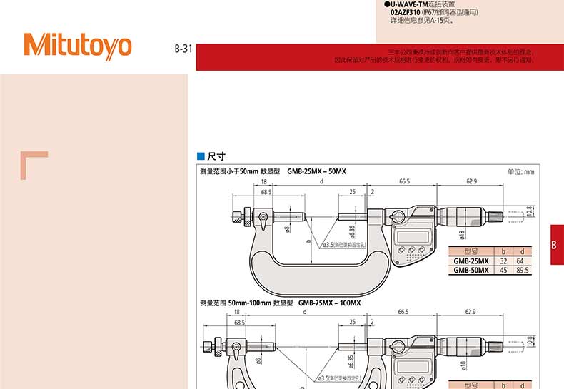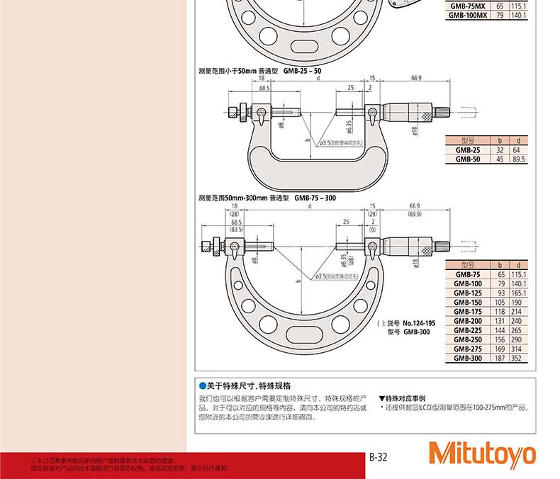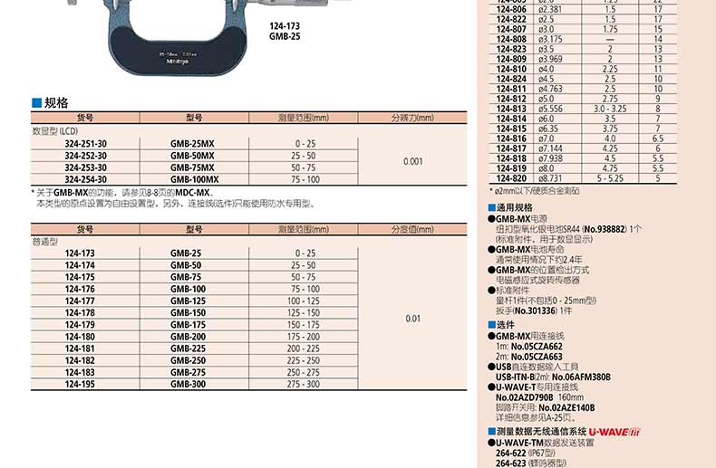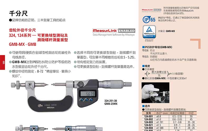 日本三豐(mitutoyo)齒輪外徑千分尺324, 124 系列 — 可更換球型測砧及測微螺桿測量面型GMB-MX · GMB