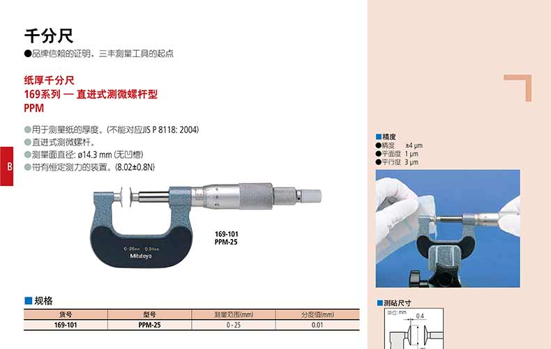產品名稱:日本三豐(mitutoyo)紙厚千分尺169 系列 — 直進式測微螺桿型PPM