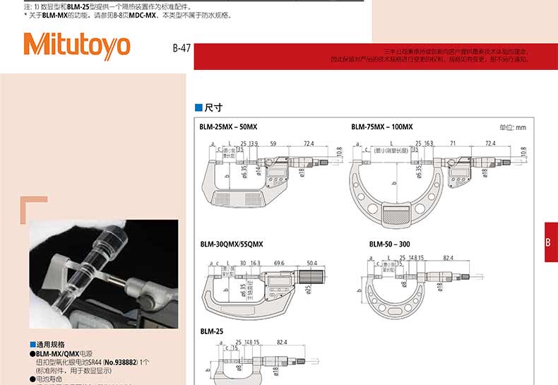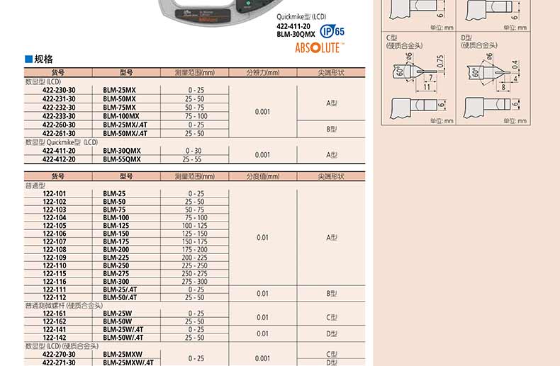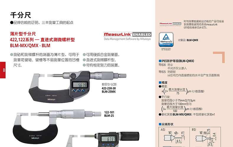 產(chǎn)品名稱:日本三豐(mitutoyo)薄片型千分尺422,122 系列 — 直進(jìn)式測(cè)微螺桿型 BLM-MXQ/MX · BLM