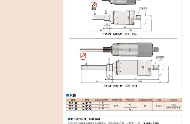 日本三豐(mitutoyo)測微頭148 系列 — 大直徑微分筒易于讀數(shù) 短行程