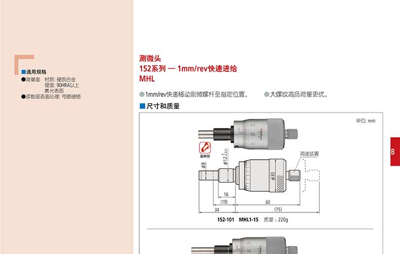 產(chǎn)品名稱:日本三豐(mitutoyo)測微頭152 系列 — 1mm/rev 快速進給
