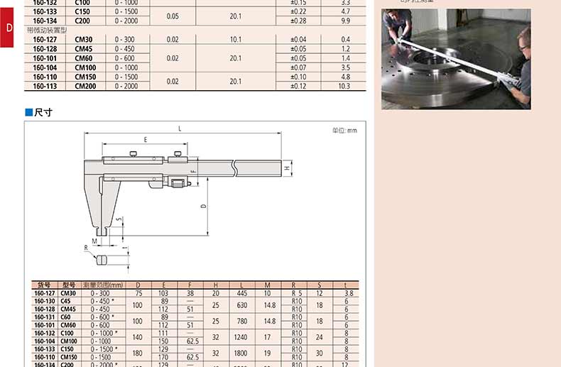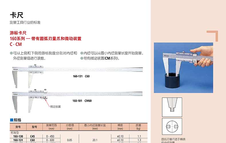 產品名稱:日本三豐(mitutoyo)機械游標卡尺160 系列帶有圓弧刃量爪和微動裝置